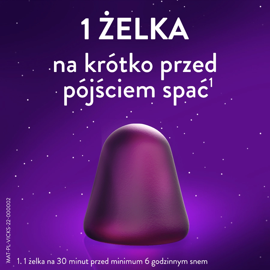 1 żelka na 30 minut przed minimum 6 godzinnym snem.